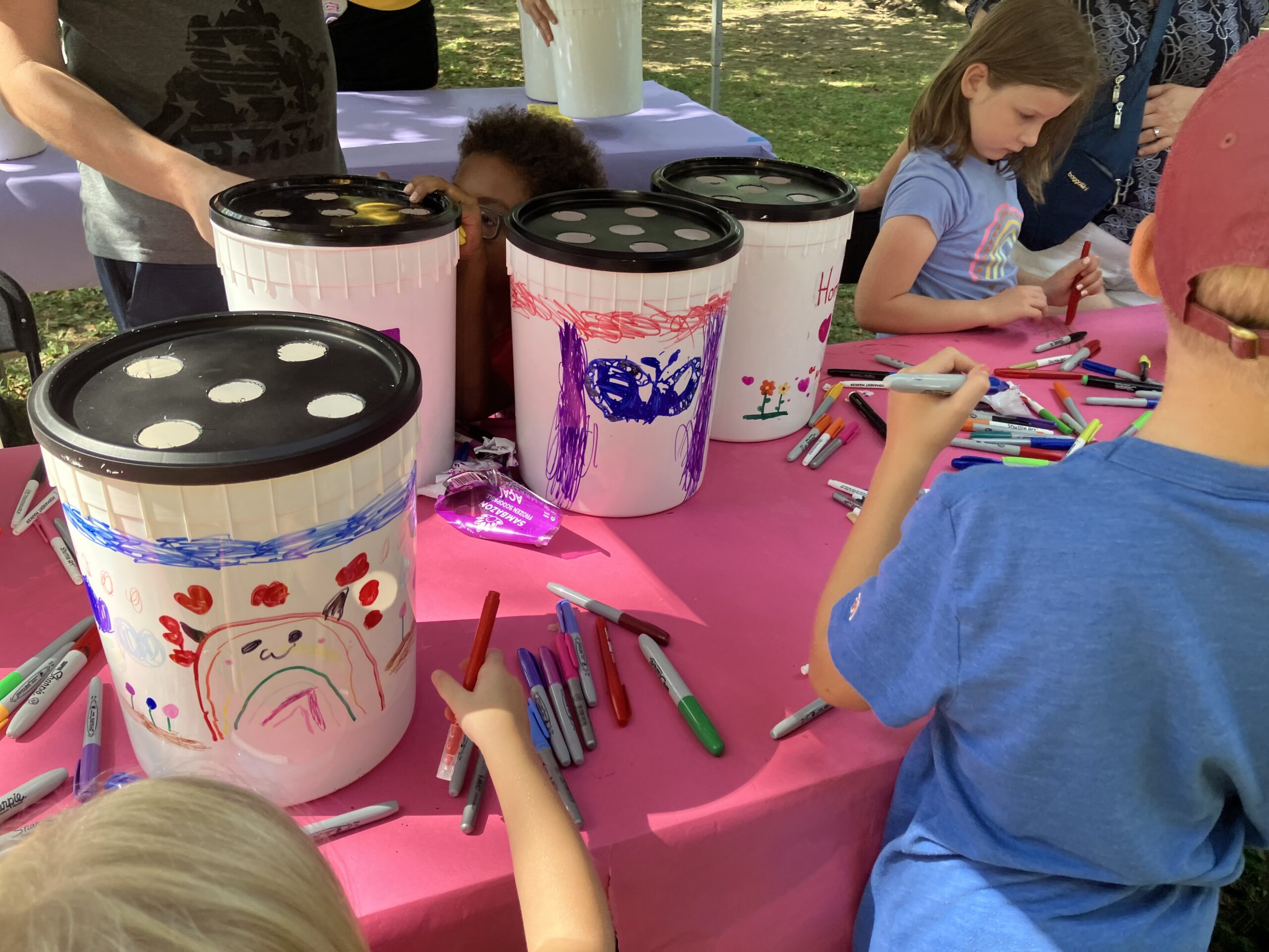 Kids decorate free mosquito buckets designed to lure the mosquitoes and prevent their eggs from maturing. The buckets were donated by Pulp Juice and Smoothies.